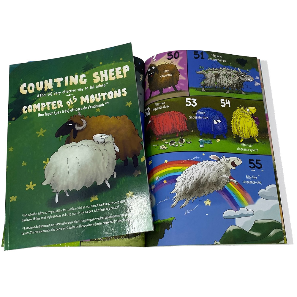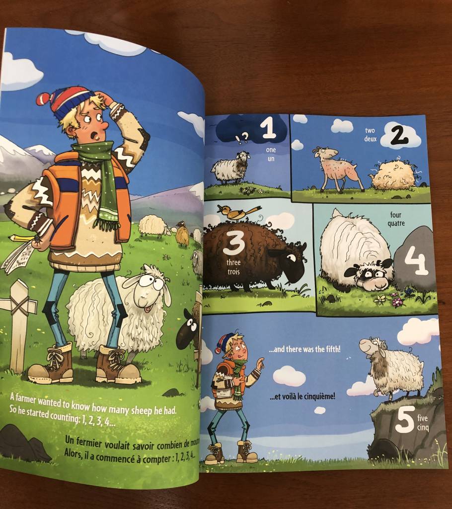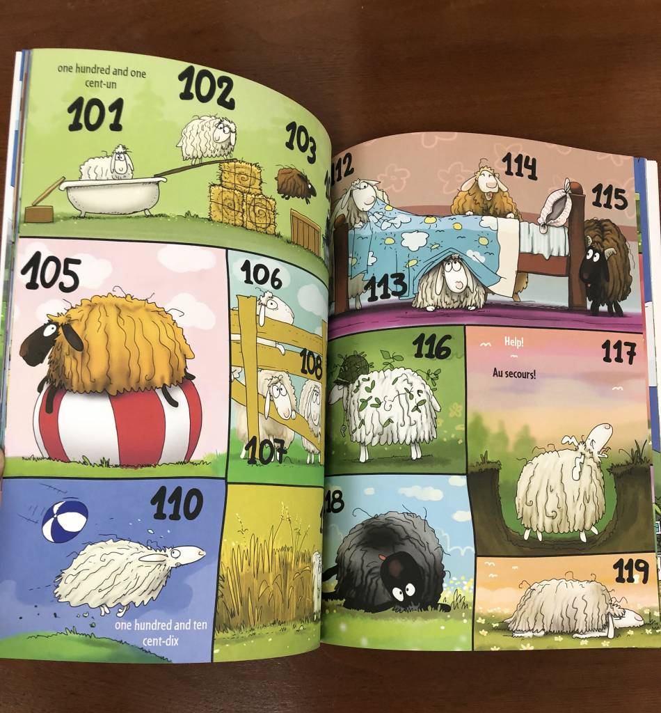Younger “counters” may experience some challenges when several numbers are included in the same illustration and do not follow a left to right, top to bottom sequence, with one example being 154-164, “A rainbow of sheep! / un arc-en-ciel de moutons!”, where the numbers are presented in a clockwise manner.