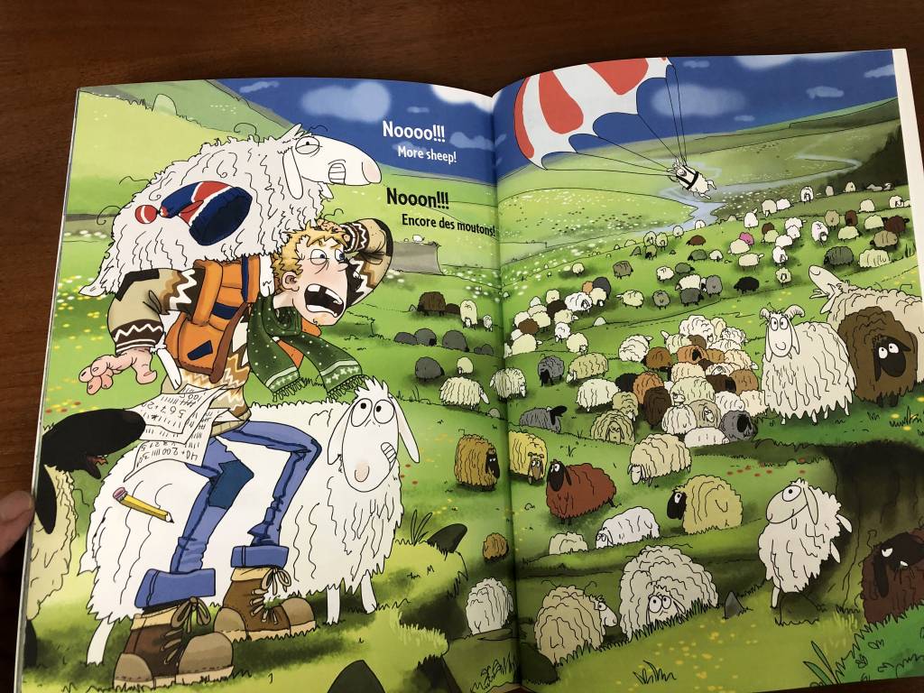 The text, from 1-101, essentially consists of the cardinal number which is then spelled out in English and then French. From 110-170, only the 10s are accompanied by the English/French text. Sometimes a sheep’s situation will lead to additional text being included. Consequently, when sheep 76 gets caught in a hole, it cries “Help! / Au secours!” The farmer continues to make cameo appearances throughout the book, often accompanied by brief text. The farmer’s locating sheep 85, 86 and 87 in an arctic-like setting leads to his exclaiming, “...sooo cooold.../...siiii frooiid...”